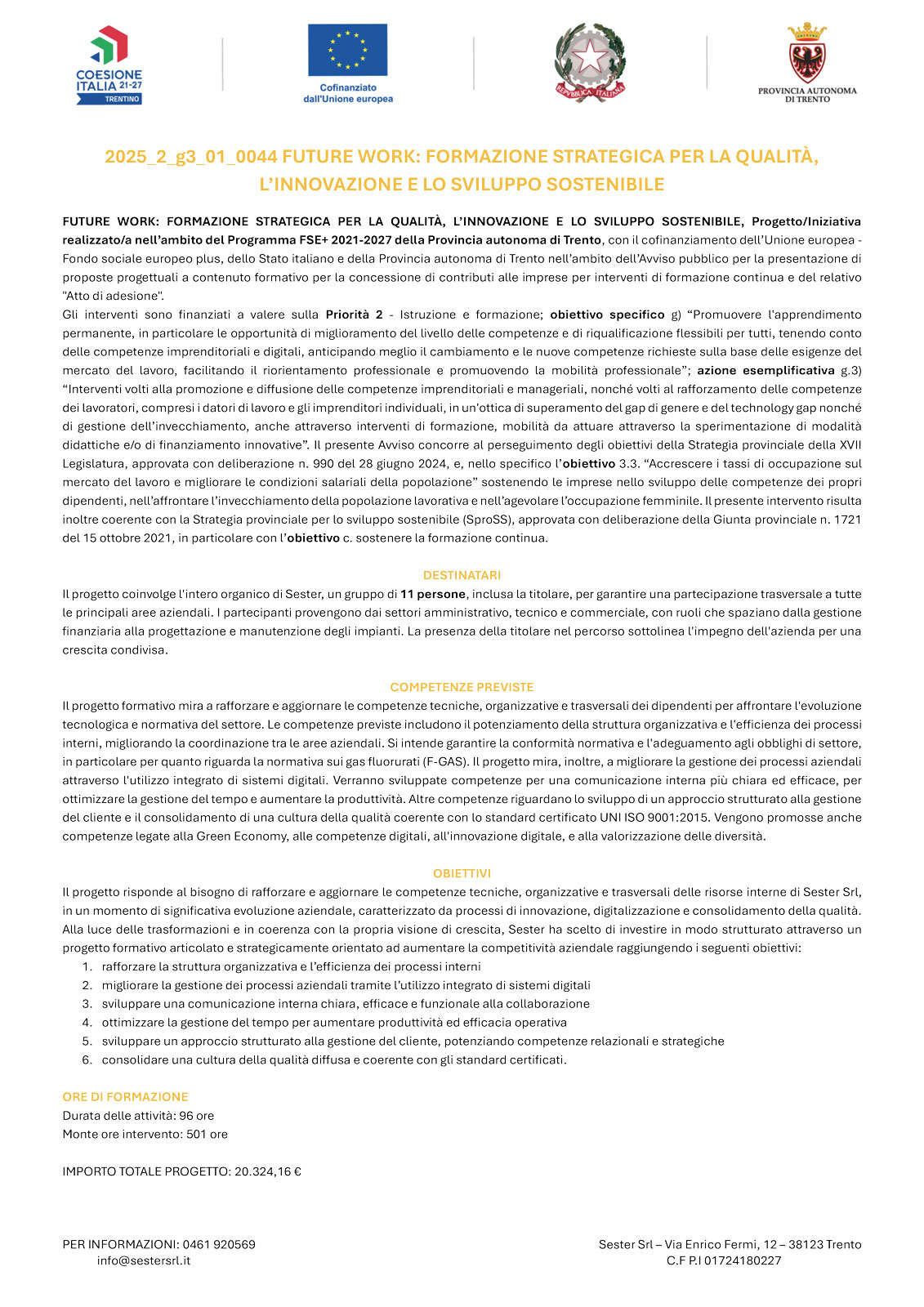Partecipiamo al progetto “𝐹𝑈𝑇𝑈𝑅𝐸 𝑊𝑂𝑅𝐾: 𝑓𝑜𝑟𝑚𝑎𝑧𝑖𝑜𝑛𝑒 𝑠𝑡𝑟𝑎𝑡𝑒𝑔𝑖𝑐𝑎 𝑝𝑒𝑟 𝑙𝑎 𝑞𝑢𝑎𝑙𝑖𝑡𝑎̀, 𝑙’𝑖𝑛𝑛𝑜𝑣𝑎𝑧𝑖𝑜𝑛𝑒 𝑒 𝑙𝑜 𝑠𝑣𝑖𝑙𝑢𝑝𝑝𝑜 𝑠𝑜𝑠𝑡𝑒𝑛𝑖𝑏𝑖𝑙𝑒”, realizzato nell’ambito del Programma FSE+ 2021–2027 della Provincia autonoma di Trento, con il cofinanziamento dell’Unione Europea, dello Stato italiano e della Provincia autonoma di Trento.